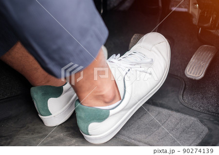 Close up the foot pressing foot pedal of a car to drive. Accelerator and brake pedal in a car. Driver driving the car by pushing accelerator and break pedals of the car. inside vehicle. control pedal.