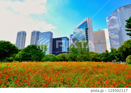 濱離宮恩賜庭園:秋日的黃色大波斯菊和汐留建築群