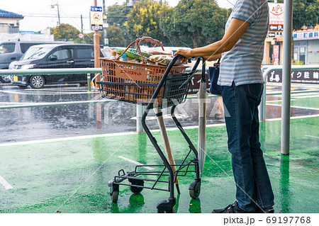 在一個雨天購物一個女人帶著生態籃子,等著雨停下來