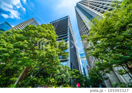 日本東京城市景觀,七月,從內堀街一側俯瞰充滿綠意的“大手町Hotoria”