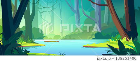 Tropical jungle with river background banner in cartoon design. Wildlife overgrown rainforest with lianas on green trees, lush bushes, ferns and grass, blue water pond. Vector cartoon illustration