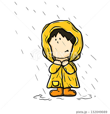 Kid wearing yellow raincoat worrying the rain cartoon illustration