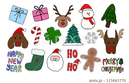Christmas and New Year drawings in crayon including Santa Claus, snowman, snowflake, Xmas tree, gift, reindeer, puppy, gingerbread man cookie, sock and clover leaf for winter sticker, decoration, logo