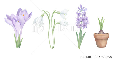 First flowers set with bulbous plants. Watercolor collection of purple crocuses, snowdrops, hyacinth and sprouted bulb in a pot isolated on white. Floral clipart for postcard design and scrapbooking.