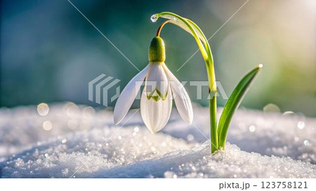 A single white snowdrop flower with green stem bends over a bed of sparkling