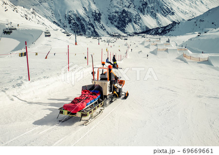 Snowmobile machine with sled and equipment riding fast hurry up driver to help injured skier or snowboarder at accident on winter mountain resort. Emergency rescue vehicle at ski slope piste downhil
