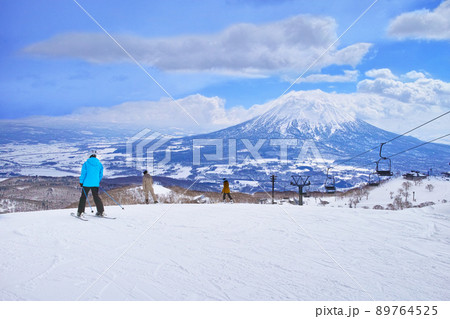 冬季,滑雪者在留壽都滑雪場滑雪前眺望羊蹄山