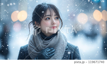 AI 圖片:雪景中微笑的年輕女子與雪人