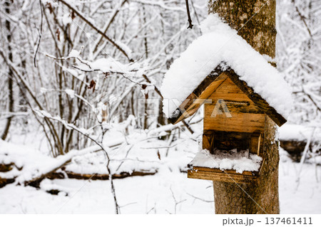 wooden bird feeder in snowy forest of city park