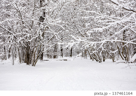 snow-covered way in snowy forest of city park