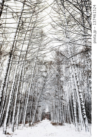 snow-covered larch alley in forest of city park