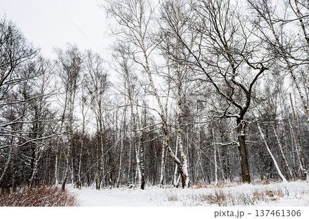 snow-covered cbirch and oak grove of city park