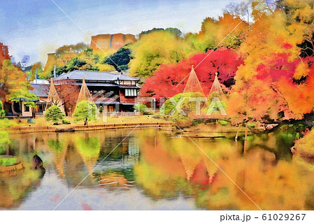 花田紀念花園。池塘和草坪廣場(2月)東京都足立區