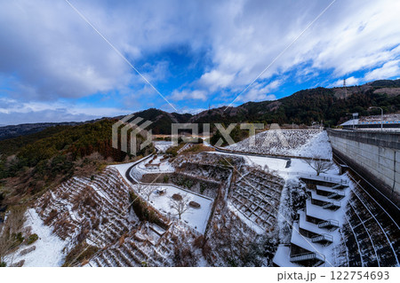 白雪皚皚的奈良布目水壩:布目川東北側的雪面在陽光下閃閃發光