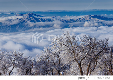 從丹澤和塔野嶽山的雲層上看到箱根和阿席達卡山,樹木被霜覆蓋