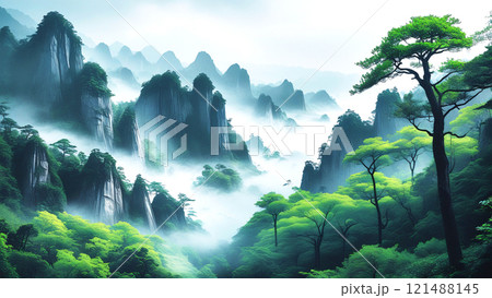 日式山水墨畫,山巒疊嶂,雲霧繚繞