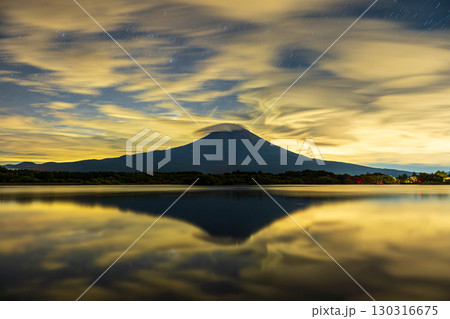 午夜時分,富士山和雲朵飄過狸湖