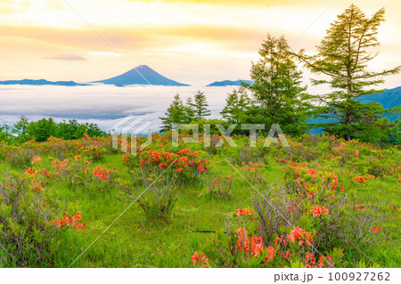 [富士山]初夏從甘有山看到的富士山、杜鵑花和雲海[山梨縣]