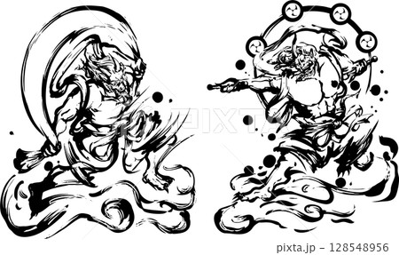 日本、印度神、Raijin Fujin 雕像的插圖。宗教、神社和寺廟