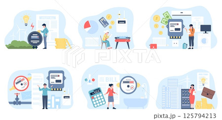 Utilities paying. Household payments for gas electricity water and house service. People surprised and sad with bills for resource, recent vector scenes