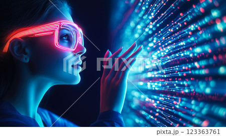 A woman interacts with a neural network display. The concept of online learning, future technology, and the curiosity-driven exploration of AI. Generative AI