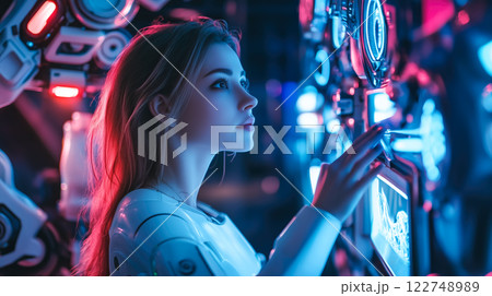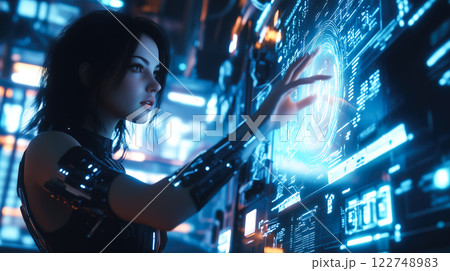 A modern lady interacts with futuristic technology, engaging with holographic displays. The concept of innovation, artificial intelligence, and the evolution of human-technology interaction. Generativ