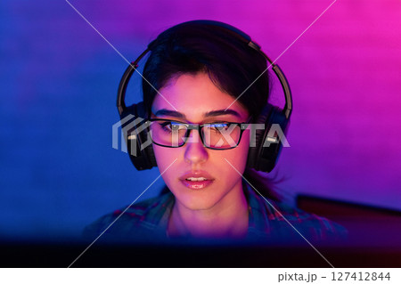 A young woman with dark hair, wearing headphones and glasses, sits in front of a computer screen. She appears to be focused on the screen, with a serious expression on her face