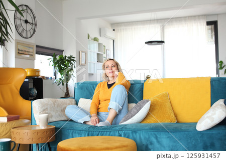 Teen girl relaxing comfortably on sofa listening with headphones.