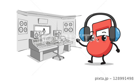 Cartoon Red Musical Note Wearing Headphones in Sound Recording Studio Vector Illustration