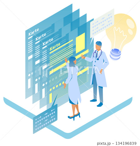 醫生和工作人員使用電子病歷 DX 改善工作的等距插圖