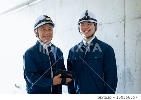 Engineer with blueprint and tablet working factory producing electricity oil energy.