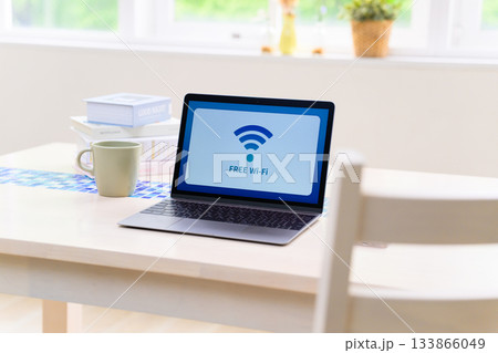 筆記型電腦螢幕和桌面區域均顯示「免費Wi-Fi」標誌