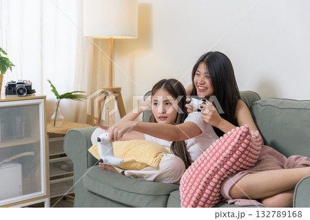 Two young women friends play video game console, teenagers enjoying home entertainment, having fun playing exciting game with controllers, joyful relaxation.