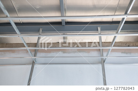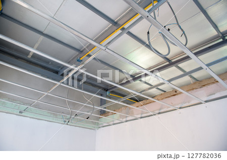 Hopeful progress of interior renovation with aluminium ceiling framework. electrical wiring installation reveals complex grid system during home improvement project