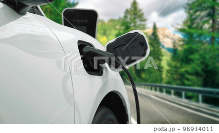 Progressive concept by electric car at the charging station on the hill road.