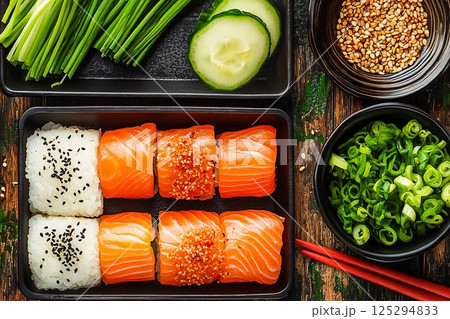 Fresh sushi ingredients on a dark surface at a vibrant kitchen setting