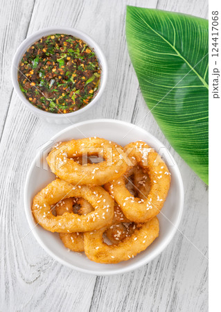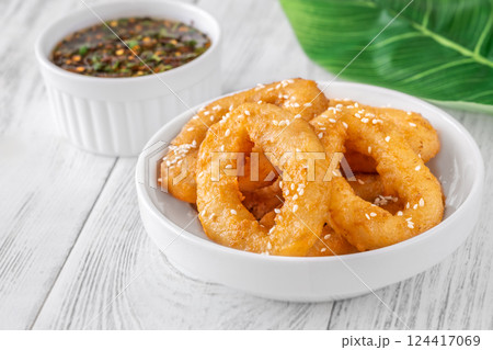 Crispy battered calamari rings with sesame seeds and spicy Asian dipping sauce