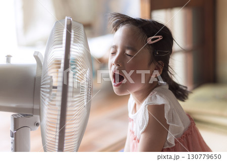防暑形象:孩子用涼爽的頸環和便攜式風扇消暑