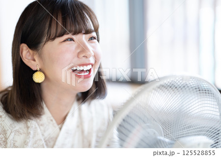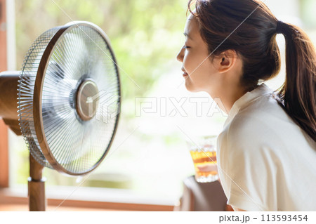 一位年輕女子在一棟古老民宅的門廊上在風扇前放鬆