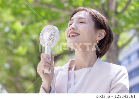 一位女士在清新的綠色公園裡用便攜式風扇納涼