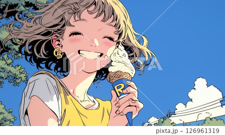 在夏日的天空下,一位年輕女子正在吃軟冰淇淋(蛋筒冰淇淋)