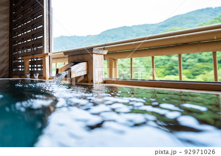 湯河原町萬葉公園湯河原總湯川路、露台座位、千歲川和新綠