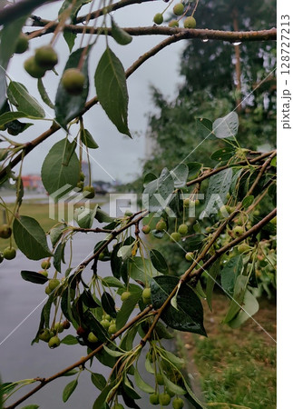 raindrops on autumn leaves and unripe fruits in quiet city park during rainy day. closeup.