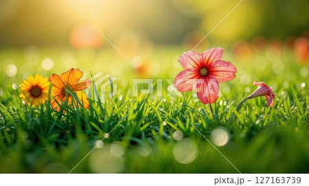Colorful summer flowers and grass with sparkling dew
