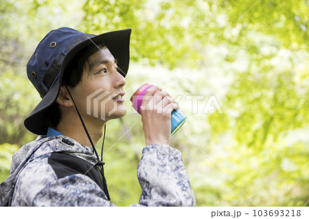 一個年輕人在森林裡喝一杯戶外圖片