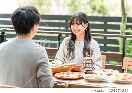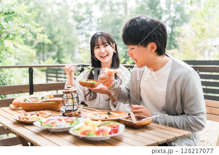 情侶在木甲板、露台座位和陽台座位上用餐(glamping/bellamp)