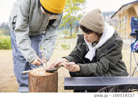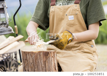 為篝火製作羽毛棒的年輕女子獨自露營圖片