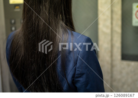 夢想形象:一個穿著制服的女人爬上長樓梯的後視圖