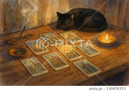 黑貓與塔羅牌 靜謐占卜桌 水彩神秘插畫