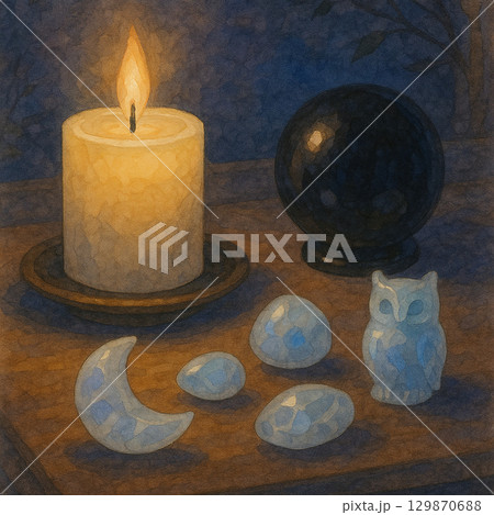 水晶與塔羅牌旁的開放筆記本 靈性水彩插畫